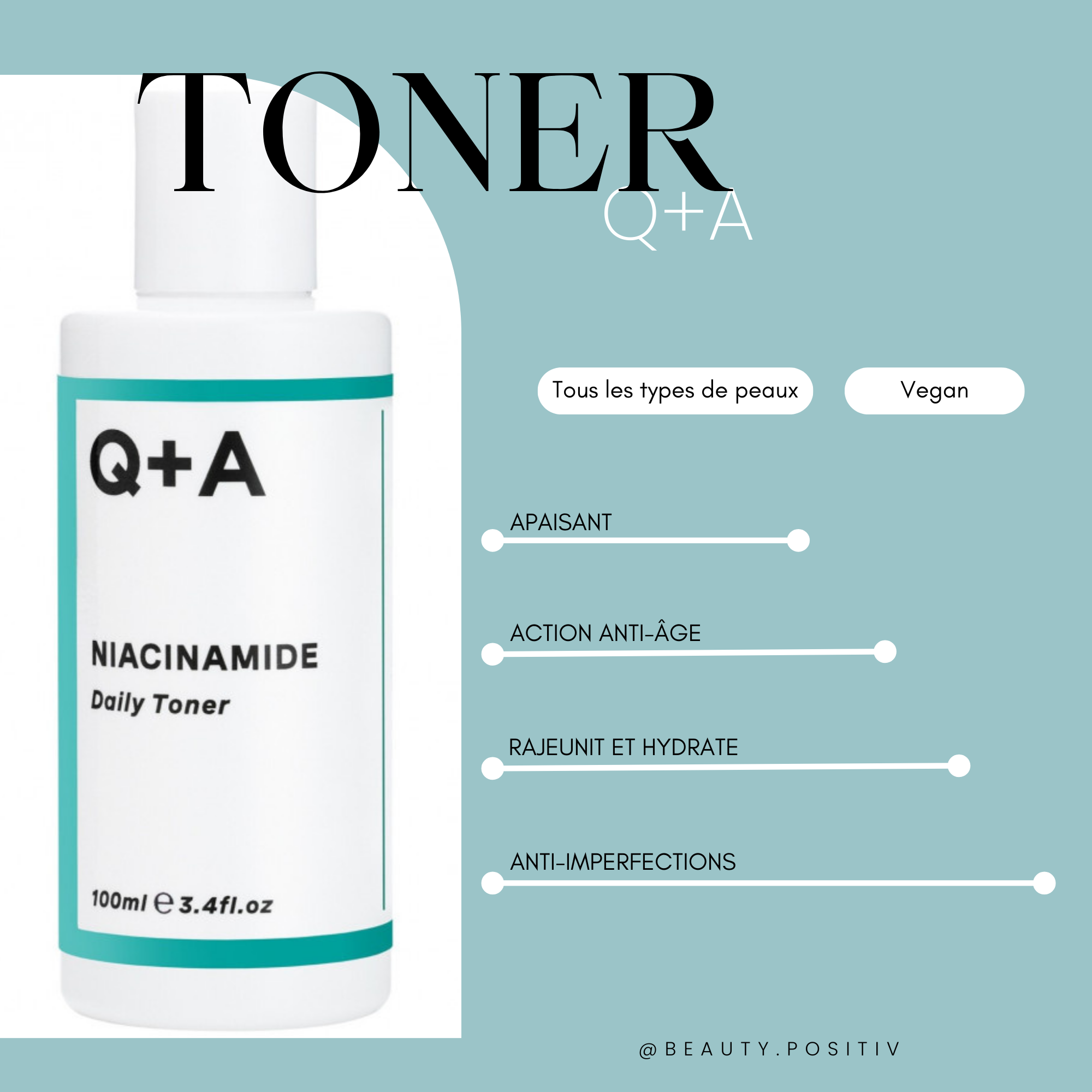 Une fois que le double nettoyage est ok, on prépare la peau avec le … le… LE TONER : Niacinamide Daily Toner (attention il reste peu de quantité). La niacinamide est un actif essentiel pour la peau. Elle aide à calmer les rougeurs et les imperfections tout en minimisant l’apparence des pores. Ce tonique a des vertus anti-âge, calmantes et hydratantes #magic